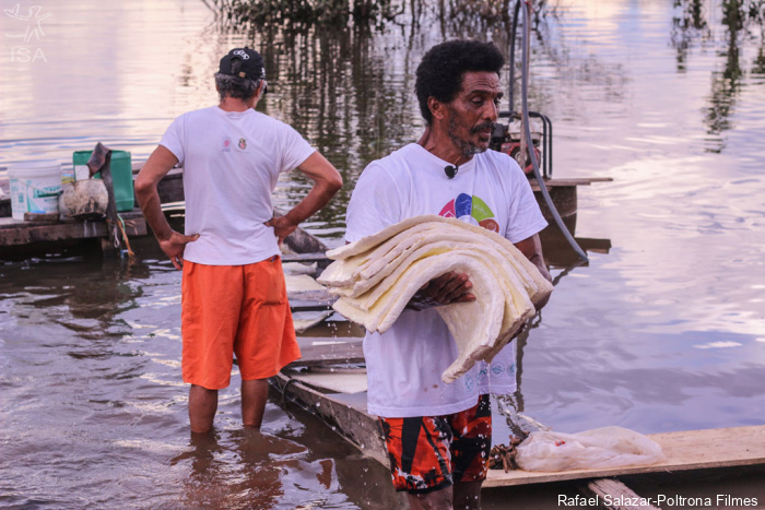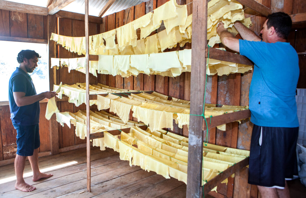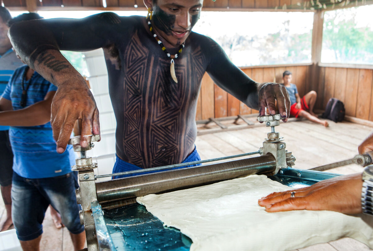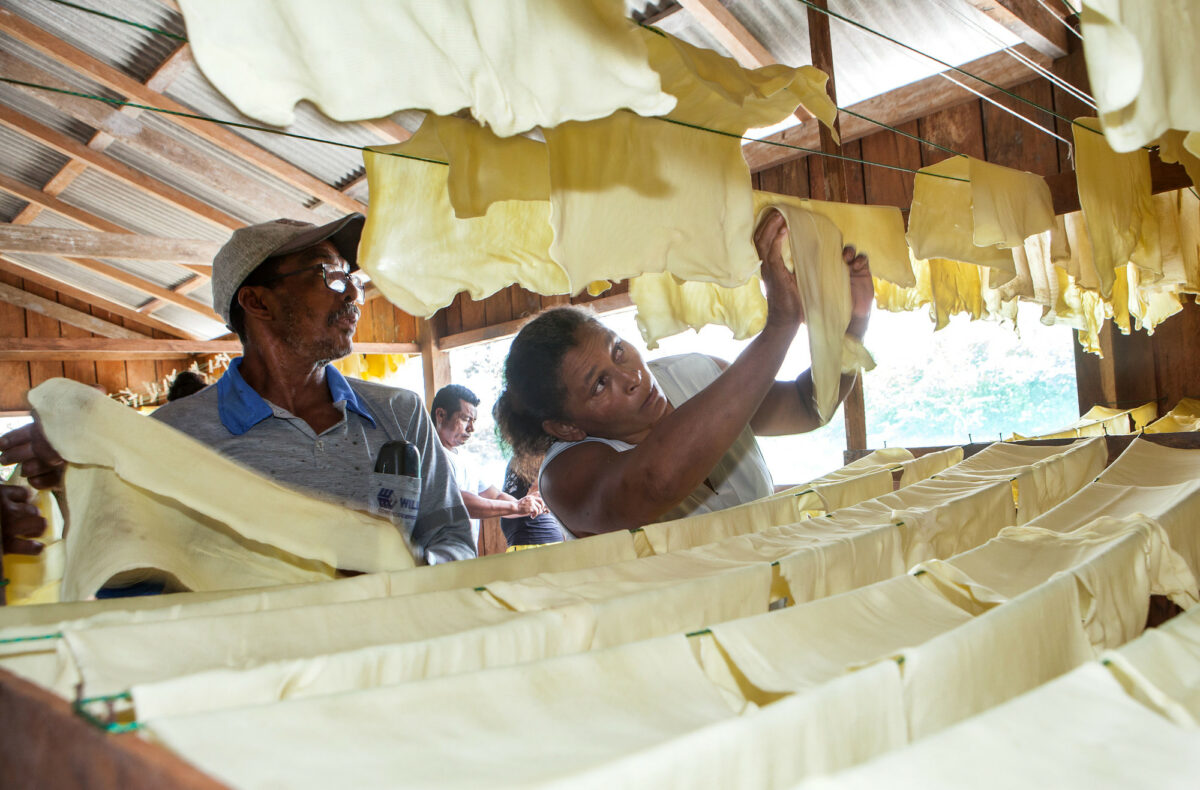Alguns desses parceiros são o Instituto Socioambiental (ISA) e do Instituto de Manejo e Certificação Florestal e Agrícola (IMAFLORA), que são organizações não governamentais que fazem o importante e responsável trabalho de mapear e conectar os povos guardiões da floresta com as empresas, que também estão buscando garantir a permanência e subsistência deles nos territórios. O encontro com essas ONGs foi possível por meio da nossa relação com a AMCE. Outro parceiro que nos auxilia é a empresa QR Borrachas Quirino, localizada no estado de São Paulo, que realiza o processo de transformação da borracha para uso industrial.